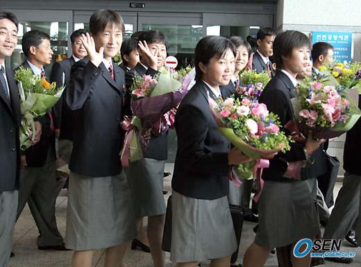 오는 31일부터 열리는 동아시아축구선수권대회에 참가할 북한 남녀대표팀이 26일 오전 평양 순안공항을 출발, 서해 직항로를 통해 인천공항으로 입국했다. 선수들이 보도진의 플래시 세례에 손을 흔들며 자연스럽게 반응하고 있다./인천공항=손용호 기자 spjj@osen.co.kr [Copyright ⓒ OSEN(www.osen.co.kr) 무단전재 및 재배포 금지]