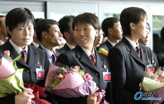 오는 31일부터 열리는 동아시아축구선수권대회에 참가할 북한 남녀대표팀이 26일 오전 평양 순안공항을 출발, 서해 직항로를 통해 인천공항으로 입국했다. 북한 여자 선수들이 꽃다발을 들고 밝은 표정으로 이야기를 나누고 있다./인천공항=주지영 기자 jj0jj0@osen.co.kr [Copyright ⓒ OSEN(www.osen.co.kr) 무단전재 및 재배포 금지]