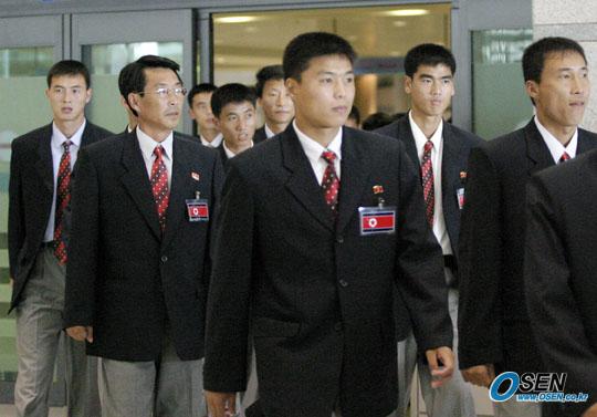 입국장을 나오는 북한 남자 선수들