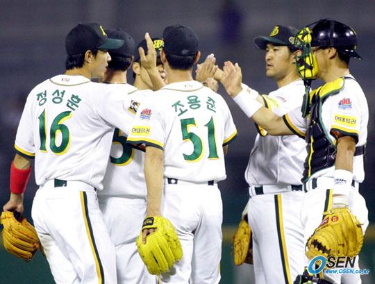 26일 현대 유니콘스와 두산 베어스의 수원 경기서 별로 힘 안들이고 2-0으로 깔끔하게 승리한 현대 선수들이 경기 후 마운드에 모여 하이파이브를 나누고 있다./수원=주지영 기자 jj0jj0@osen.co.kr [Copyright ⓒ OSEN(www.osen.co.kr) 무단전재 및 재배포 금지]