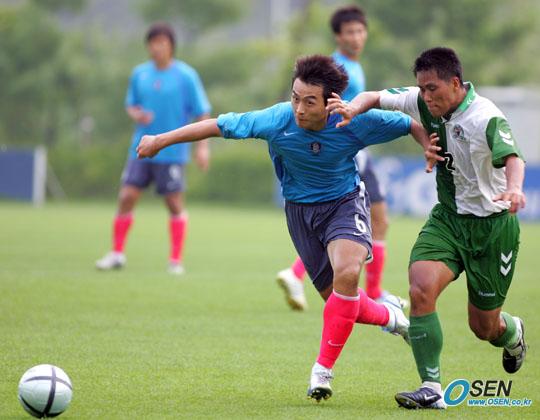 27일 오후 파주 국가대표 트레이닝 센터에서 열린 대표팀과 건국대의 연습경기에서 이동국(왼쪽)이 상대와 몸싸움을 벌이며 볼을 따라 뛰고 있다./파주=주지영 기자 jj0jj0@osen.co.kr [Copyright ⓒ OSEN(www.osen.co.kr) 무단전재 및 재배포 금지]