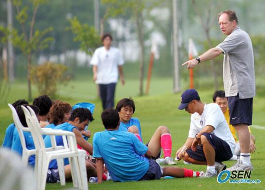 27일 오후 파주 국가대표 트레이닝 센터에서 열린 대표팀과 건국대의 연습경기 30분 1쿼터가 끝난 뒤 본프레레 감독이 잔디에 앉아 있는 이동국(의자 바로 뒤)에게 뭐라고 말하자 이동국이 미소를 지으며 고개를 숙이고 있다./파주=주지영 기자 jj0jj0@osen.co.kr [Copyright ⓒ OSEN(www.osen.co.kr) 무단전재 및 재배포 금지]