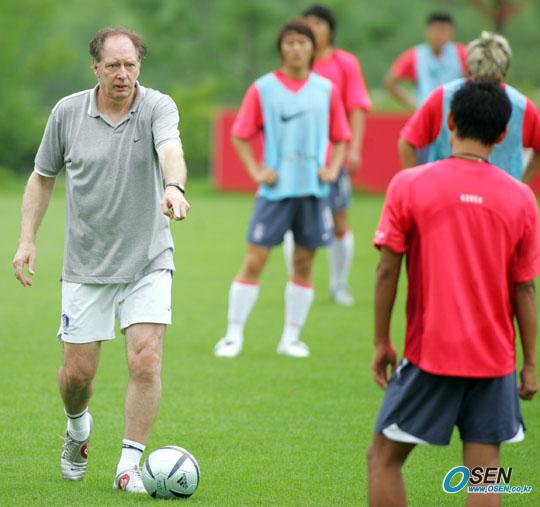 28일 오후 4시 30분 파주 대표팀 트레이닝 센터에서 시작된 축구국가대표팀 훈련 도중 본프레레 감독이 이천수에게 지시를 내리며 시범을 보이고 있다. /파주=주지영 기자 jj0jj0@osen.co.kr [Copyright ⓒ OSEN(www.osen.co.kr) 무단전재 및 재배포 금지]