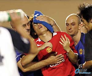 맨체스터 유나이티드의 아시아 투어에서 맹활약하며 주가를 높이고 있는 박지성(24.맨체스터 유나이티드)이 불의의 부상을 입었다. 박지성은 28일 도쿄국립경기장에서 벌어진 가시마 앤틀러스와의 경기 후반 24분 크리스티아누 호나우도와 교체돼 그라운드에 나섰지만 후반 39분 상대 골키퍼 소가하타 히토시와 충돌하며 왼쪽 눈가가 찢어지는 부상을 입고 벤치로 물러났다. 박지성은 후반 39분 왼쪽 측면을 오버래핑한 필립 네빌의 크로스를 연결받기 위해 왼쪽 골에어리어로 쇄도하던 중 수비수 태클에 걸려 넘어지며 골키퍼와 충돌, 왼쪽 눈부위가 찢어졌다. 박지성은 이에 앞서 1-2로 뒤진 후반 38분 골키퍼와 1대 1로 맞서는 결정적인 찬스를 잡았지만 골로 연결시키지 못해 아쉬움을 남겼다. 페널티에어리어 오른쪽에서 반니스텔루이가 멋진 힐패스를 찔러줬고 골에어리어 정면에서 골키퍼와 맞선 박지성은 오른발 슈팅을 날렸지만 크로스바를 넘어가고 말았다. 맨체스터 유나이티드는 이날 공수에 걸쳐 매끄럽지 못한 플레이를 펼치며 1-2로 패배, 레알 마드리드에 이어 일본 원정에서 망신을 당했다. 맨체스터 유나이티드는 루이스 사하를 최전방 스트라이커로, 라이언 긱스와 크리스티아누 호나우도를 좌우 날개로 내세웠고 데이빗 존스와 클레베르손, 리암 밀러를 미드필더로, 존 오셰어, 리오 퍼디낸드, 게리 네빌, 필립 네빌를 포백으로 배치한 4-3-3 시스템으로 경기에 나섰지만 경기 초반 수비수들의 실수로 선제골을 허용하며 이날의 ‘망신’을 예고했다. 전반 5분 페널티에어리어 왼쪽에서 필립 네빌이 크로스를 헤딩으로 걷어낸다는 것이 허공을 갈랐고 이틈을 타 페널티에어리어 왼쪽 측면으로 침투한 모토야마는 원바운드 된 공을 정확히 왼발 슛, 맨체스터의 골네트를 갈랐다. 반격에 나선 맨체스터는 전반 9분 호나우도와 긱스의 콤비 플레이로 승부를 원점으로 돌렸다. 왼쪽 측면을 돌파한 호나우도의 땅볼 크로스를 골에어리어 왼쪽에서 긱스가 동점골로 연결시킨 것. 그러나 모토야마는 전반 24분 첫 골과 똑 같은 장면을 연출하며 결승골을 뽑아냈다. 모토야마는 페널티에어리어 내 왼쪽에서 아크 정면에서 올린 대각선 크로스를 왼발 논스톱 슛, 골네트를 가르며 맨체스터 수비수들을 다시 한번 농락했다. 맨체스터는 하프타임에 웨인 루니, 앨런 스미스, 실베스트르 등을 대거 투입한 데 이어 후반 16분 루트 반니스텔루이, 후반 24분 박지성을 기용하며 총력전을 벌였지만 수 차례 잡은 골 찬스에서 단 한 골도 터트리지 못하는 빈곤한 골결정력을 보이며 결국 무릎을 꿇었다. 김정민 기자 cjones10@osen.co.kr [Copyright ⓒ OSEN(www.osen.co.kr) 무단전재 및 재배포 금지]