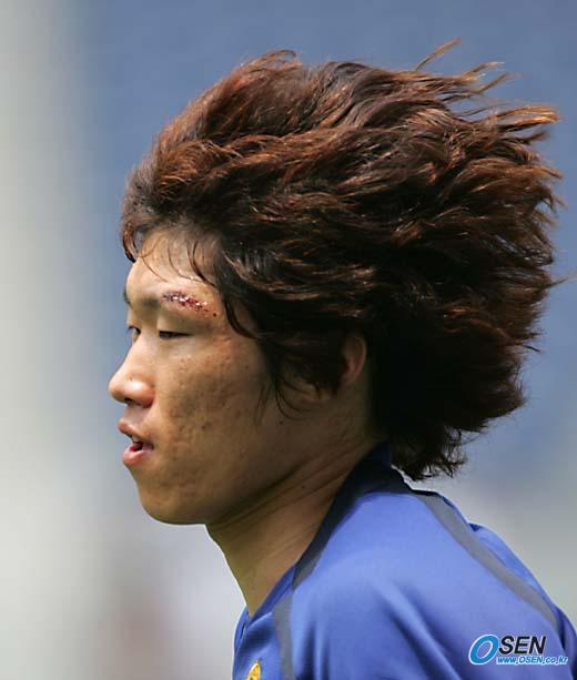 29일 사이타마 스타디움에서 실시된 맨체스터 유나이티드의 훈련에 박지성이 눈두덩을 8바늘을 꿰매고 나타났다. 전날 가시마 앤틀러스와의 경기에서 골키퍼와 부딪쳐 부상을 당한 박지성은 훈련을 정상적으로 소화했지만 30일 우라와전에는 결장한다. 달리고 있는 박지성의 머리가 날리는 모습이 마치 만화의 주인공 같아 보인다./우라와=손용호 기자 spjj@osen.co.kr [Copyright ⓒ OSEN(www.osen.co.kr) 무단전재 및 재배포 금지]