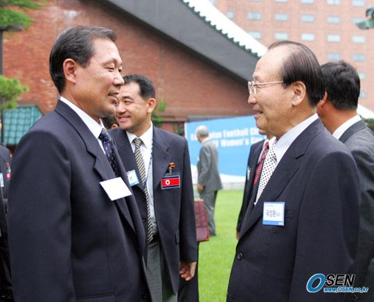 30일 서울 신라호텔 영빈관에서 열린 제2회 동아시아선수권대회 전야제에서 곽정환 한국프로축구연맹회장(오른쪽)과 이경일 북한 단장이 환담하고 있다./신라호텔=주지영 기자 jj0jj0@osen.co.kr [Copyright ⓒ OSEN(www.osen.co.kr) 무단전재 및 재배포 금지]