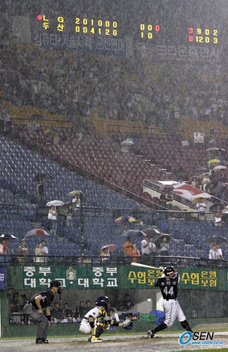 비가 많이 내리는 가운데 2일 두산 베어스와 LG 트윈스의 잠실경기 9회초가 진행되고 있다. 8회말 1사 1,2루서 장원진의 대타 김동주 타석 때는 경기가 잠시 중단되기도 했다./잠실=주지영 기자 jj0jj0@osen.co.kr [Copyright ⓒ OSEN(www.osen.co.kr) 무단전재 및 재배포 금지]