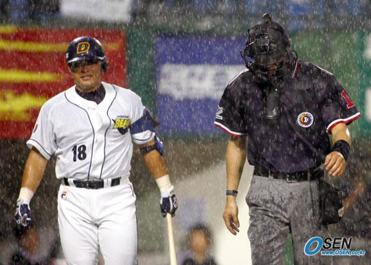 2일 두산 베어스와 LG 트윈스의 잠실경기가 두산의 8회말 1사 1,2루서 장원진의 대타 김동주 타석 때 많은 비로 잠시 중단됐다. 최규순 구심(오른쪽)이 경기를 중단시킨 뒤 김동주와 함께 그라운드를 나서고 있다./잠실=주지영 기자 jj0jj0@osen.co.kr [Copyright ⓒ OSEN(www.osen.co.kr) 무단전재 및 재배포 금지]