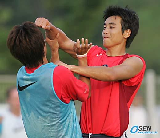 북한과의 제2회 동아시아선수권대회 2차전을 하루 앞둔 한국대표팀이 3일 오후 대전 월드컵경기장 보조구장에서 마무리 훈련을 했다. 훈련을 마친 뒤 이동국(오른쪽)이 포항 스틸러스 후배이기도 한 오범석에게 마치 '꿀밤'을 주는 듯한 동작을 취하고 있다./대전=손용호 기자 spjj@osen.co.kr [Copyright ⓒ OSEN(www.osen.co.kr) 무단전재 및 재배포 금지]