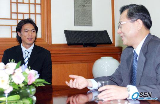 4일 오후 서울 세종로의 문화관광부 장관실에서 홍명보 대한축구협회 이사가 정동채 장관으로부터 한일 축구 친선대사 임명장을 받은 뒤 환담을 나누고 있다./주지영 기자 jj0jj0@osen.co.kr [Copyright ⓒ OSEN(www.osen.co.kr) 무단전재 및 재배포 금지]