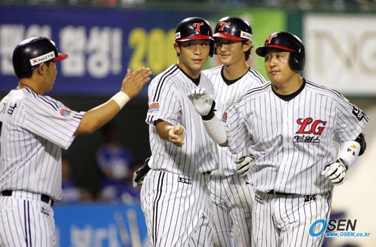 5일 LG 트윈스와 삼성 라이온즈의 잠실 경기 LG의 4회말 1사 만루서 조인성(오른쪽)이 그랜드슬램을 터뜨려 4-2로 역전시킨 뒤 먼저 홈을 밟고 기다리던 박용택 정의윤 박기남의 환영을 받고 있다./잠실=주지영 기자 jj0jj0@osen.co.kr [Copyright ⓒ OSEN(www.osen.co.kr) 무단전재 및 재배포 금지]