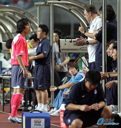 7일 대구 월드컵경기장에서 벌어진 제2회 동아시아축구선수권대회 한국과 일본의 경기 후반 중반 오른 발바닥 부상 중인 박주영이 정경호와 교체 출장했다. 박주영이 투입되기에 앞서 본프레레 감독 등 코칭스태프로부터 주문 사항을 지시받고 있다./대구=손용호 기자 spjj@osen.co.kr [Copyright ⓒ OSEN(www.osen.co.kr) 무단전재 및 재배포 금지]