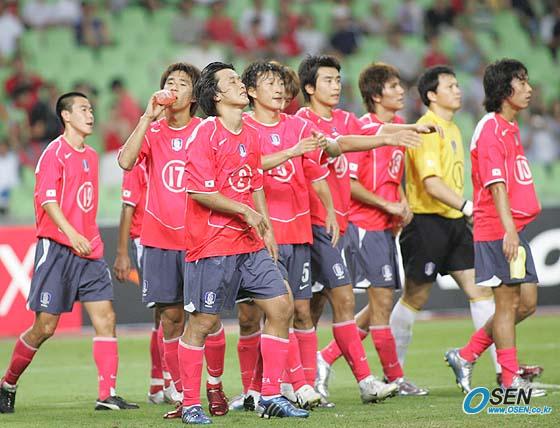 7일 대구 월드컵경기장에서 벌어진 제2회 동아시아축구선수권대회 한국과 일본의 경기서 일본이 1-0으로 이겨 한국을 최하위로 끌어내렸다. 한국은 부상 중인 박주영까지 투입했지만 끝내 골을 터뜨리지 못했다. 선수들이 관중들에게 인사한 뒤 참담한 표정으로 경기장을 빠져나가고 있다./대구=손용호 기자 spjj@osen.co.kr [Copyright ⓒ OSEN(www.osen.co.kr) 무단전재 및 재배포 금지]