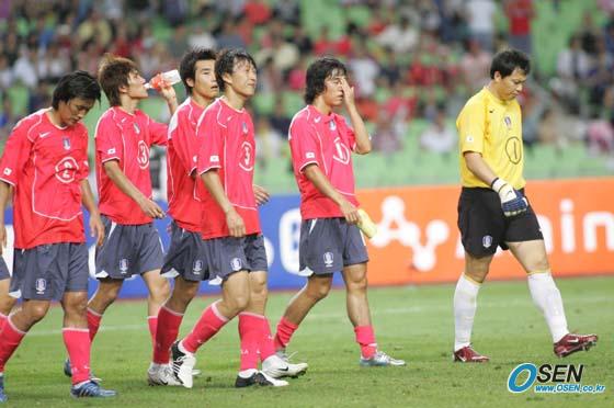 7일 대구 월드컵경기장에서 벌어진 제2회 동아시아축구선수권대회 최종일 일본전에서 0-1로 패해 이번 대회 출전 4개국 중 최하위가 된 한국 선수들이 붉은 악마들에게 인사를 하고 돌아선 뒤 침통한 표정으로 경기장을 빠져 나가고 있다./대구=손용호 기자 spjj@osen.co.kr [Copyright ⓒ OSEN(www.osen.co.kr) 무단전재 및 재배포 금지]