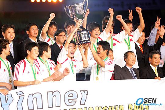 7일 대구 월드컵경기장에서 벌어진 제2회 동아시아축구선수권대회 최종일 경기서 북한을 2-0으로 이겨 1승 2무로 우승을 차지한 중국 선수들이 시상식에서 우승컵을 들고 기뻐하고 있다./대구=주지영 기자 jj0jj0@osen.co.kr [Copyright ⓒ OSEN(www.osen.co.kr) 무단전재 및 재배포 금지]