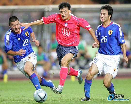 7일 대구 월드컵경기장에서 벌어진 제2회 동아시아축구선수권대회 최종일 일본전에서 정경호가 모니와(왼쪽)와 곤노 사이로 볼을 드리블해 들어가고 있다./대구=주지영 기자 jj0jj0@osen.co.kr [Copyright ⓒ OSEN(www.osen.co.kr) 무단전재 및 재배포 금지]