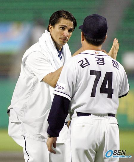 9일 두산 베어스와 현대 유니콘스의 잠실경기서 8이닝 3피안타 10탈삼진 무실점으로 호투, 2-0 완승을 이끈 두산 선발 투수 리오스가 경기 후 김경문 감독의 축하를 받고 있다./잠실=주지영 기자 jj0jj0@osen.co.kr [Copyright ⓒ OSEN(www.osen.co.kr) 무단전재 및 재배포 금지]