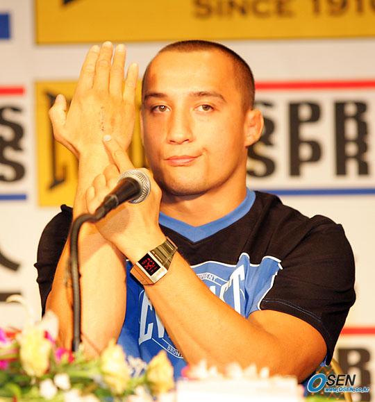 10일 서울 홍은동 그랜드 힐튼 호텔에서 스포츠용품업체 스프리스와 데니스 강의 공식 후원 계약 조인식이 열렸다. 데니스 강이 세미노프와의 프라이드 FC 경기 도중 다친 오른손 부위를 보여주고 있다./주지영 기자 jj0jj0@0sen.co.kr [Copyright ⓒ OSEN(www.osen.co.kr) 무단전재 및 재배포 금지]