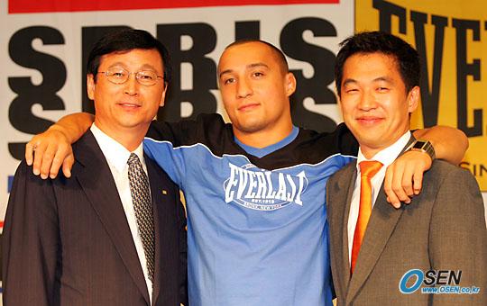 10일 서울 홍은동 그랜드 힐튼 호텔에서 스포츠용품업체 스프리스와 데니스 강의 공식 후원 계약 조인식이 열렸다. 데니스 강이 조인식을 마친 뒤 스프리스 김세제 사장(왼쪽), 자신의 에이전시인 엔프리안 박광현 대표의 어깨에 손을 올리고 여유있는 모습으로 포즈를 취하고 있다./주지영 기자 jj0jj0@0sen.co.kr [Copyright ⓒ OSEN(www.osen.co.kr) 무단전재 및 재배포 금지]