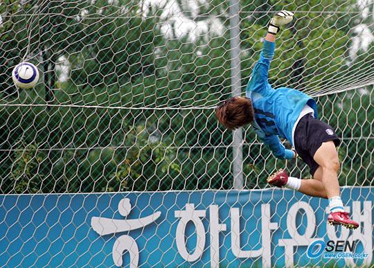 11일 파주 트레이닝 센터에서 실시된 대표팀 훈련 도중 미니경기에서 골키퍼 김영광이 몸을 날려봤지만 골을 허용하고 있다. /파주=주지영 기자 jj0jj0@osen.co.kr [Copyright ⓒ OSEN(www.osen.co.kr) 무단전재 및 재배포 금지]