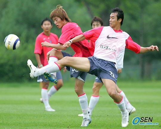 12일 남북 통일축구를 이틀 앞둔 대표팀이 파주 트레이닝 센터에서 2시간에 걸쳐 강도 높은 훈련을 가졌다. 미니게임중 이동국이 김정우에 한발 앞서 슈팅을 날리고 있다./파주=주지영기자jj0jj0@osen.co.kr [Copyright ⓒ OSEN(www.osen.co.kr) 무단전재 및 재배포 금지]