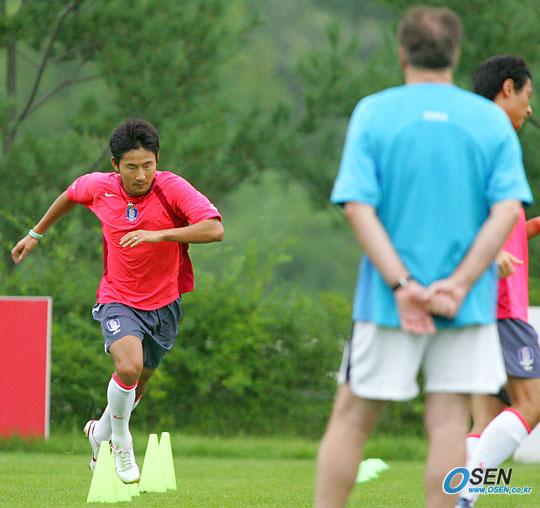 12일 남북 통일축구를 이틀 앞둔 대표팀이 파주 트레이닝 센터에서 2시간에 걸쳐 강도 높은 훈련을 가졌다. 본프레레 감독이 이천수의 훈련 모습을 지켜보고 있다./파주=주지영기자jj0jj0@osen.co.kr [Copyright ⓒ OSEN(www.osen.co.kr) 무단전재 및 재배포 금지]