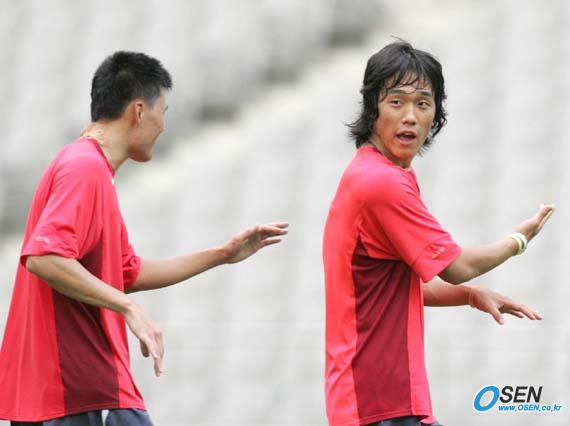 남북통일축구를 하루 앞두고 한국대표팀이 13일 오후 서울 상암 월드컵경기장에서 1시간 30분 가량 미니게임과 코너킥 등 세트플레이 연습으로 마무리 훈련을 실시했다. 훈련이 끝난 뒤 박주영(오른쪽)과 정경호가 비슷한 제스처를 써가며 이야기를 나누고 있다./상암=손용호 기자 spjj@osen.co.kr [Copyright ⓒ OSEN(www.osen.co.kr) 무단전재 및 재배포 금지]