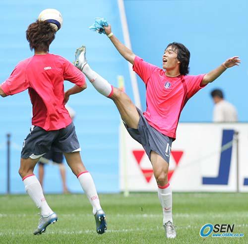 남북통일축구를 하루 앞두고 한국대표팀이 13일 오후 서울 상암 월드컵경기장에서 1시간 30분 가량 미니게임과 코너킥 등 세트플레이 연습으로 마무리 훈련을 실시했다. 박주영이 연습게임에서 발을 높이 든 모습이 마치 발레리나 같다./상암=손용호 기자 spjj@osen.co.kr [Copyright ⓒ OSEN(www.osen.co.kr) 무단전재 및 재배포 금지]