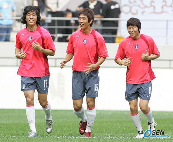 남북통일축구를 하루 앞두고 한국대표팀이 13일 오후 서울 상암 월드컵경기장에서 1시간 30분 가량 미니게임과 코너킥 등 세트플레이 연습으로 마무리 훈련을 실시했다. 지난해까지 청소년대표팀에서 함께 뛰었던 박주영 오범석 백지훈(왼쪽으로부터)이 가볍게 뛰며 밝게 웃고 있다./상암=손용호 기자 spjj@osen.co.kr [Copyright ⓒ OSEN(www.osen.co.kr) 무단전재 및 재배포 금지]