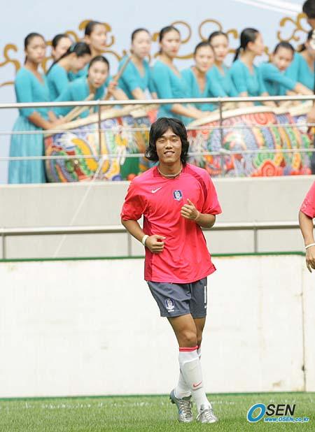남북통일축구를 하루 앞두고 한국대표팀이 13일 오후 서울 상암 월드컵경기장에서 1시간 30분 가량 미니게임과 코너킥 등 세트플레이 연습으로 마무리 훈련을 실시했다. 14일 행사 연습을 위해 구장을 찾은 무용단원들이 가볍게 뛰고 있는 박주영 쪽을 쳐다보고 있다./상암=손용호 기자 spjj@osen.co.kr [Copyright ⓒ OSEN(www.osen.co.kr) 무단전재 및 재배포 금지]