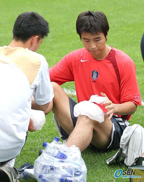 남북통일축구를 하루 앞두고 한국대표팀이 13일 오후 서울 상암 월드컵경기장에서 1시간 30분 가량 미니게임과 코너킥 등 세트플레이 연습으로 마무리 훈련을 실시했다. 훈련을 끝낸 뒤 이동국이 발목과 무릎에 아이싱을 하고 있다./상암=손용호 기자 spjj@osen.co.kr [Copyright ⓒ OSEN(www.osen.co.kr) 무단전재 및 재배포 금지]
