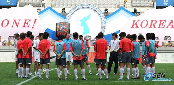 남북통일축구를 하루 앞두고 한국대표팀이 13일 오후 서울 상암 월드컵경기장에서 1시간 30분 가량 미니게임과 코너킥 등 세트플레이 연습으로 마무리 훈련을 실시했다. 훈련이 끝난 뒤 경기장 중앙에 모인 선수들이 본프레레 감독의 이야기를 듣고 있다. 경기장에 한반도기 등이 그려진 구조물이 설치되는 등 통일축구 분위기가 나고 있다./상암=손용호 기자 spjj@osen.co.kr [Copyright ⓒ OSEN(www.osen.co.kr) 무단전재 및 재배포 금지]