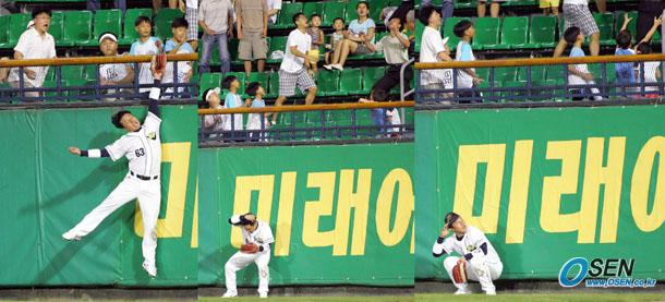 13일 두산 베어스와 SK 와이번스의 잠실경기 1-1이던 SK의 6회초 무사 1,3루서 이진영의 홈런 타구를 두산 우익수 김창희가 점프해 캐치하려 했지만 펜스를 넘어가고 말았다. 김창희가 그라운드에 앉아 타구가 넘어간 지점을 바라보고 있다. /잠실=주지영 기자 jj0jj0@osen.co.kr [Copyright ⓒ OSEN(www.osen.co.kr) 무단전재 및 재배포 금지]