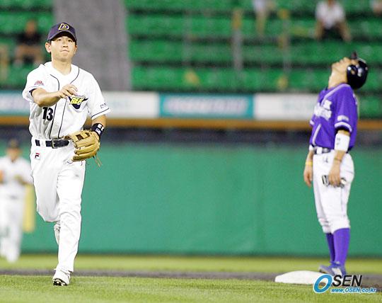13일 두산 베어스와 SK 와이번스의 잠실경기 SK의 5회초 2사 1루서 김재현의 땅볼 때 2루에서 두산 유격수 손시헌(왼쪽)에게 베이스 터치 아웃된 1루 주자 김민재가 고개를 들어 하늘을 보며 아쉬워하고 있다./잠실=주지영 기자 jj0jj0@osen.co.kr [Copyright ⓒ OSEN(www.osen.co.kr) 무단전재 및 재배포 금지]
