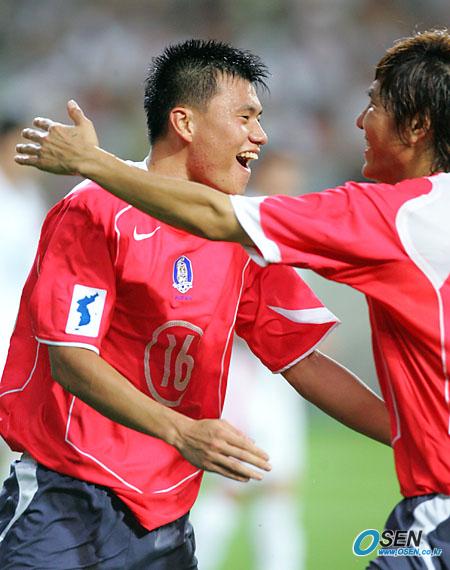 14일 서울 상암 월드컵경기장에서 벌어진 남북 통일축구 경기 전반 남측의 선제골을 넣은 정경호(왼쪽)가 김동진과 함께 기뻐하고 있다./상암=주지영 기자 jj0jj0@osen.co.kr [Copyright ⓒ OSEN(www.osen.co.kr) 무단전재 및 재배포 금지]