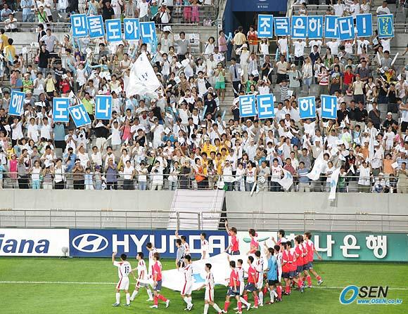 14일 서울 상암 월드컵경기장에서 벌어진 남북 통일축구 경기는 남측이 북측에 3-0으로 이겼다. 양측 선수들이 경기 후 '해도 하나, 달도 하나, 조국은 하나, 민족도 하나다!' 라는 문구가 펼쳐 진 관중석 앞을 한반도기를 들고 지나고 있다./상암=손용호기자 spjj@osen.co.kr [Copyright ⓒ OSEN(www.osen.co.kr) 무단전재 및 재배포 금지]