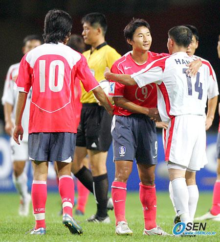 14일 서울 상암 월드컵경기장에서 벌어진 남북 통일축구 경기가 끝난 뒤 양측 선수들이 서로 격려의 인사를 나누고 있다. 이천수(오른쪽에서 두 번째)는 한성철과 포옹을 하고 박주영은 이천수의 엉덩이를 두드리고 있다./상암=주지영 기자 jj0jj0@osen.co.kr [Copyright ⓒ OSEN(www.osen.co.kr) 무단전재 및 재배포 금지]