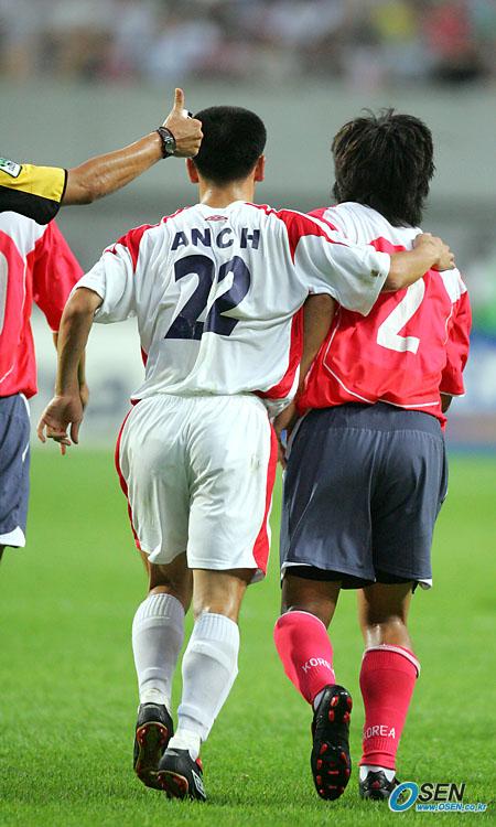 14일 서울 상암 월드컵경기장에서 벌어진 남북 통일축구 경기는 남측이 북측에 3-0으로 이겼다. 경기 중 넘어진 북측의 안철혁(왼쪽)을 남측의 유경렬이 일으켜 주자 서로 어깨동무를 하며 달리고 있다. 그 모습을 지켜 본 주심이 오른 엄지를 들어 보이고 있다./상암=주지영 기자 jj0jj0@osen.co.kr [Copyright ⓒ OSEN(www.osen.co.kr) 무단전재 및 재배포 금지]