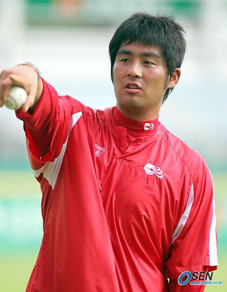 한국 프로야구 진출 이후 처음으로 15일 1군 선수로 등록한 한화 이글스의 투수 조성민이 현대 유니콘스와 의 수원 경기에 앞서 훈련하고 있다. 조성민이 더운지 동료에게 음료수를 가리키고 있다./수원=주지영 기자jj0jj0@osen.co.kr [Copyright ⓒ OSEN(www.osen.co.kr) 무단전재 및 재배포 금지]