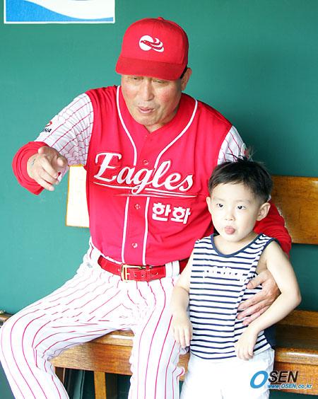 15일 현대 유니콘스와의 수원 경기에 앞서 김인식 한화 이글스 감독이 경기장을 찾은 손자와 함께 덕아웃에 함께 앉아 있다./수원=주지영 기자 jj0jj0@osen.co.kr [Copyright ⓒ OSEN(www.osen.co.kr) 무단전재 및 재배포 금지]