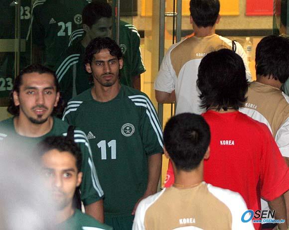 오는 17일 2006 독일월드컵 아시아 최종예선 마지막 경기인 사우디아라비전을 이틀 앞둔 15일 오후 태극전사들이 서울 상암 월드컵경기장에서 해외파 선수들이 합류한 가운데 훈련을 실시했다. 훈련을 마치고 그라운드를 떠나던 한국 대표선수들이 운동장으로 들어서던 사우디아라비아 선수들과 교차하는 가운데 한 사우디아라비아 선수가 박주영(붉은색 상의)을 쳐다보면서 마치 '처음 보는데' 하는 듯한 표정을 짓고 있다./상암=손용호 기자 spjj@osen.co.kr [Copyright ⓒ OSEN(www.osen.co.kr) 무단전재 및 재배포 금지]