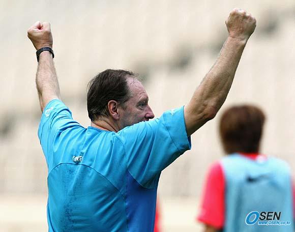 오는 17일 2006 독일월드컵 아시아 최종예선 마지막 경기인 사우디아라비전을 이틀 앞둔 15일 오후 태극전사들이 서울 상암 월드컵경기장에서 해외파 선수들이 합류한 가운데 훈련을 실시했다. 훈련 도중 멋진 슈팅에 의한 골인 장면이 나오자 본프레레 감독이 두 주먹을 불끈쥐며 만세를 부르고 있다./상암=손용호 기자spjj@osen.co.kr [Copyright ⓒ OSEN(www.osen.co.kr) 무단전재 및 재배포 금지]