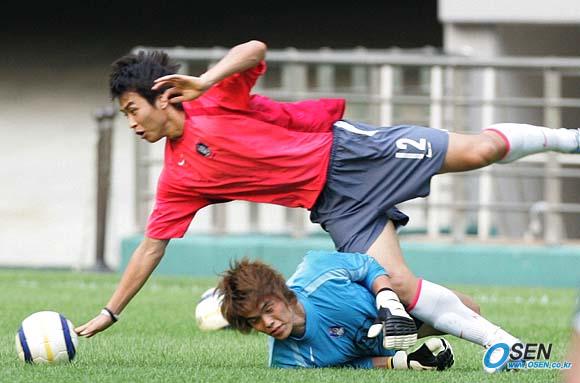 오는 17일 2006 독일월드컵 아시아 최종예선 마지막 경기인 사우디아라비전을 이틀 앞둔 15일 오후 태극전사들이 서울 상암 월드컵경기장에서 해외파 선수들이 합류한 가운데 훈련을 실시했다. 이동국이 미니게임 도중 슬라이딩하는 골키퍼 김영광과 부딪치며 넘어지고 있다./상암=손용호 기자 spjj@osen.co.kr [Copyright ⓒ OSEN(www.osen.co.kr) 무단전재 및 재배포 금지]