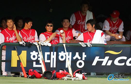 15일 현대 유니콘스와 한화 이글스의 수원경기 도중 한화의 조성민(오른쪽)이 덕아웃에서 정민철(가운데) 등 동료들과 이야기하며 웃고 있다./수원=주지영 기자 jj0jj0@osen.co.kr [Copyright ⓒ OSEN(www.osen.co.kr) 무단전재 및 재배포 금지]