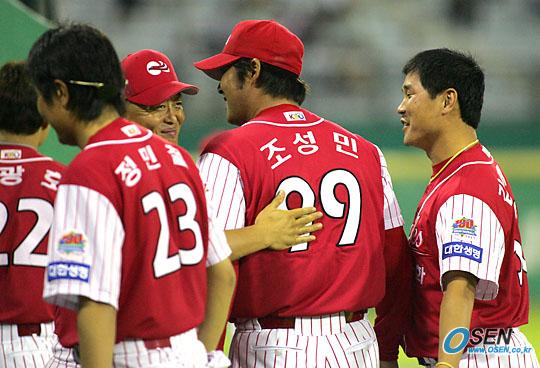 15일 현대 유니콘스와 한화 이글스의 수원경기서 한국 프로야구 데뷔전을 가진 한화의 조성민이 강판한 뒤 덕아웃 앞에서 동료들의 격려를 받고 있다./수원=주지영 기자 jj0jj0@osen.co.kr [Copyright ⓒ OSEN(www.osen.co.kr) 무단전재 및 재배포 금지]