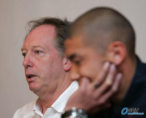 17일 서울 상암 월드컵경기장에서 벌어질 2006 독일월드컵 아시아 최종예선 사우디아라비아와의 마지막 경기를 하루 앞둔 16일 오후 한국대표팀의 본프레레 감독과 차두리가 숙소인 서울 홍은동의 그랜드힐튼 호텔에서 합동 인터뷰를 갖고 있다. 본프레레 감독이 질문에 답하고 있다./그랜드힐튼호텔=손용호 기자 spjj@osen.co.kr [Copyright ⓒ OSEN(www.osen.co.kr) 무단전재 및 재배포 금지]