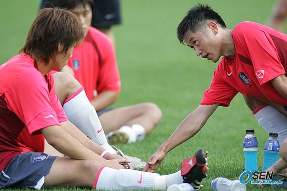 17일 서울 상암 월드컵경기장에서 벌어질 사우디아라비아와의 2006 독일월드컵 아시아 최종예선 마지막 경기를 하루 앞둔 16일 오후 태극전사들이 상암 보조구장에서 마무리 훈련을 가졌다. 훈련을 마친 뒤 이영표(오른쪽)가 손으로 가상의 그림을 그리며 수비진의 막내 김진규에게 수비 포메이션에 대해 얘기하고 있다./상암=손용호 기자 spjj@osen.co.kr [Copyright ⓒ OSEN(www.osen.co.kr) 무단전재 및 재배포 금지]