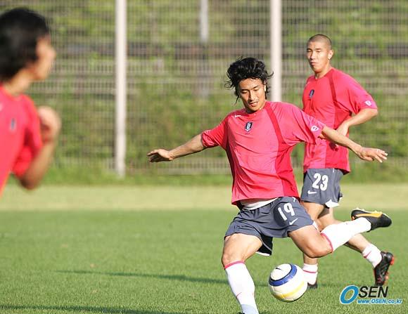 17일 서울 상암 월드컵경기장에서 벌어질 사우디아라비아와의 2006 독일월드컵 아시아 최종예선 마지막 경기를 하루 앞둔 16일 오후 태극전사들이 상암 보조구장에서 마무리 훈련을 가졌다. 공격진 전술 훈련에서 박주영(왼쪽)의 패스를 받아 안정환이 왼발 슛을 날리고 있다./상암=손용호 기자 spjj@osen.co.kr [Copyright ⓒ OSEN(www.osen.co.kr) 무단전재 및 재배포 금지]