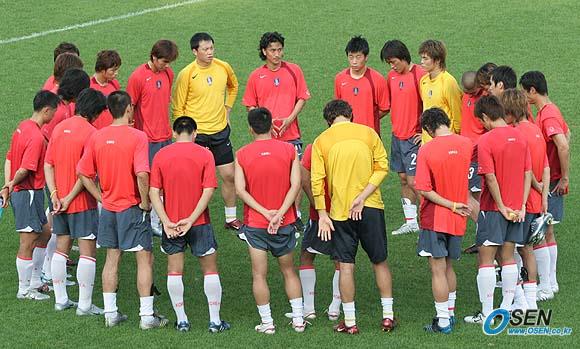 17일 서울 상암 월드컵경기장에서 벌어질 사우디아라비아와의 2006 독일월드컵 아시아 최종예선 마지막 경기를 하루 앞둔 16일 오후 태극전사들이 상암 보조구장에서 마무리 훈련을 가졌다. 훈련을 마친 뒤 최고참 이운재(가운데 노란 유니폼)가 후배들에게 필승을 독려하고 있다./상암=손용호 기자 spjj@osen.co.kr [Copyright ⓒ OSEN(www.osen.co.kr) 무단전재 및 재배포 금지]