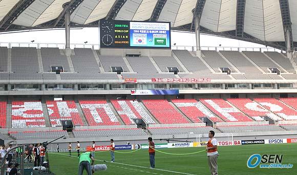 17일 2006 독일월드컵 아시아 최종예선 마지막 경기인 한국-사우디아라비아전이 벌어질 서울 상암 월드컵경기장 관중석 좌석을 장식한 모토는 '함께 가요'로 이미 본선 진출이 확정된 양국의 부담없는 입장을 반영하고 있다./상암=손용호 기자 spjj@osen.co.kr [Copyright ⓒ OSEN(www.osen.co.kr) 무단전재 및 재배포 금지]